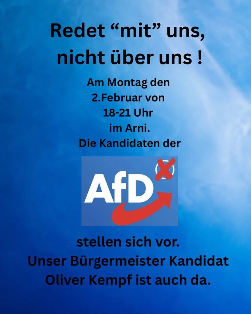 Gemeinsam essen, gemeinsam diskutieren im Raum Arnstein 📆Wann: Mittwoch, den 07.01.2026 ⏱️Zeitpunkt: Ab 18:30 Uhr 📍Wo: Mail an kv.msp@afdbayern.de 🇩🇪Wir freuen uns auf Euren Besuch